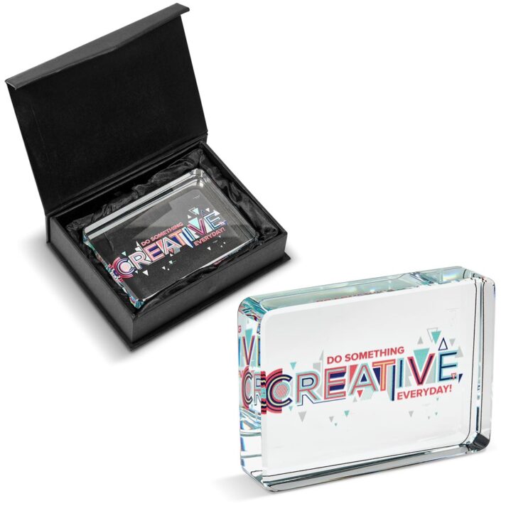 An optical glass award with a large platform for a full colour digital print. Presented in an elegant box with a padded satin lining inner.