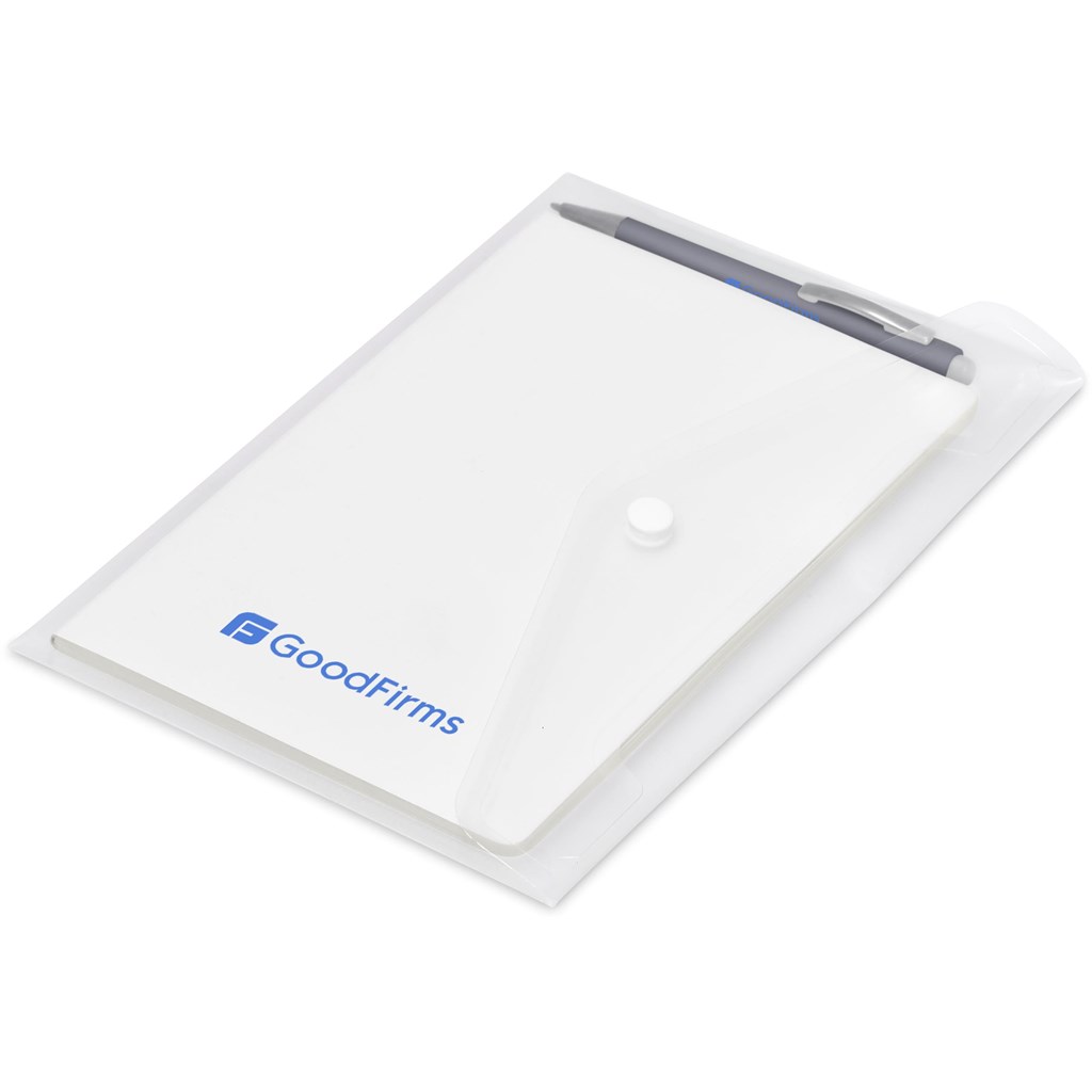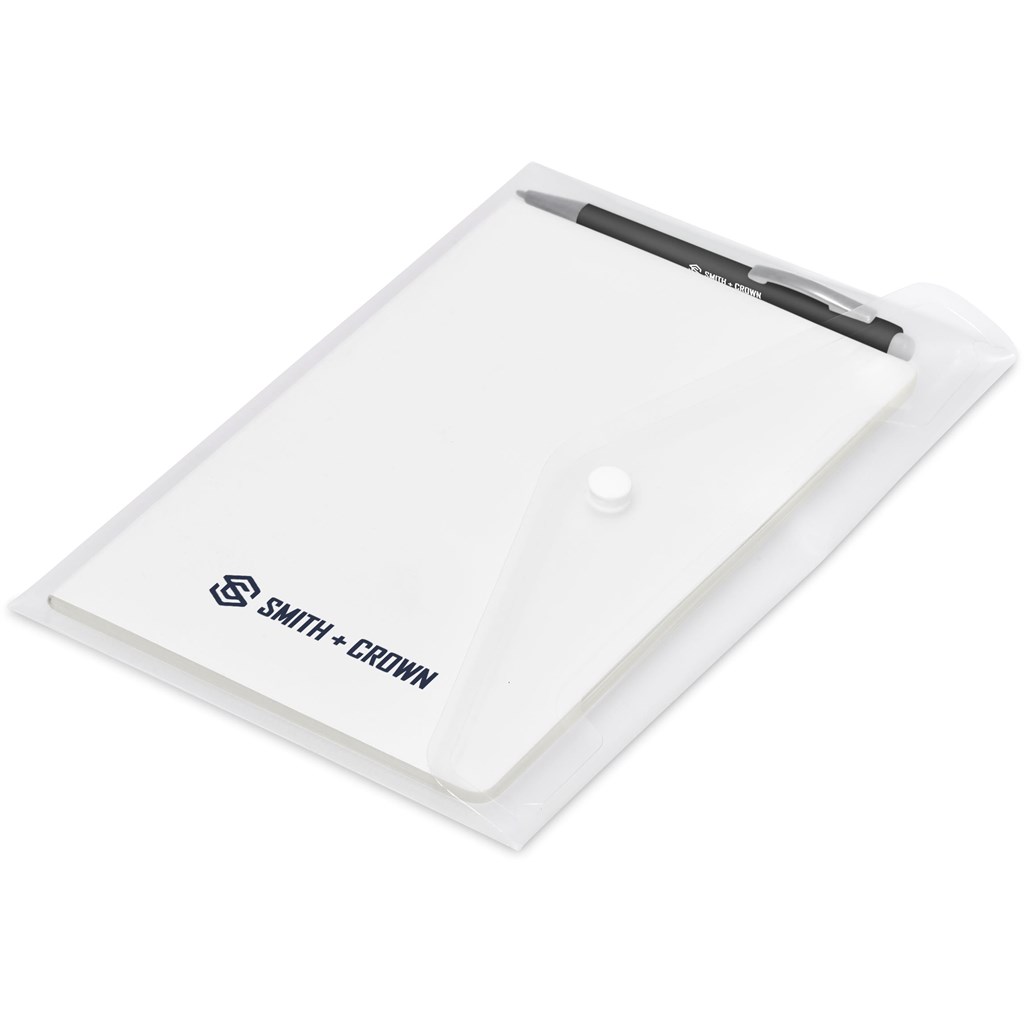 An economical notebook and pen set, especially suited for meetings, conferences and events. Packaging the notebook and pen in a pouch makes it easy to transport and to distribute these writing sets. This set consists of a white A5 notebook with a pen available in a variety of colours. The pouch has a stud button closure, and it’s made predominantly from recycled material.